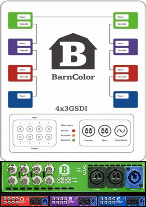Designed to be a cost-effective and easy-to-deploy solution for transmitting multiple video signals both directions on a single fiber cable. BarnColor allows you to handle up to 32 x 3G-SDI signals (16 forward and 16 returns). Each BarnColor device handles up to 8 signals (4 forward and 4 returns) and up to 4 different colors of BarnColors can be daisy chained. This flexible system is easy to install, upgrade and use. It is well suited for both fixed and temporary installations. THE CONCEPT Each BarnColor pair is available as SDI or Ethernet version and can cascade maximum 4 boxes (colors) on each side. The boxes can be combined in any variation as long as color is different. Maximum transmission distance – medium range. Equipped with rugged connectors. As a pair BarnColor can be coupled as a point to point link and will transmit/receive 4x SDI signals each way. This point to point connection can be done with any color Cascade BarnColor devices can be cascade coupled and all signals for both directions will be transferred into the same fiber connection. Follow the diagram under for connections. You will find the same diagram on top of the device. Specifications:
