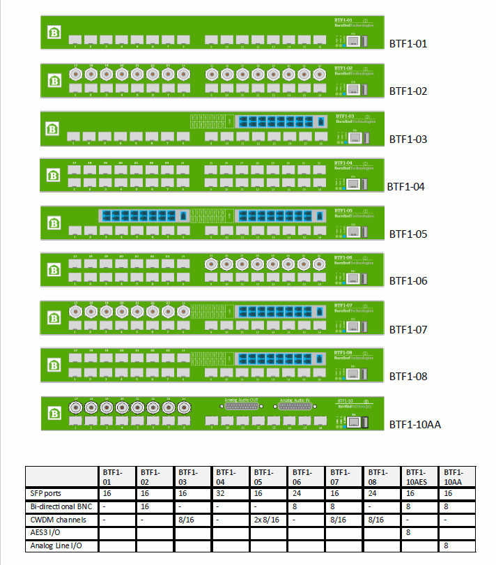 The BarnOne 10AA has 16x SFP, 8x BNC, 2x D-SUB25 w/Analog Audio, MADI router. The BarnOne series of routers can provide a 32 x 32 built-in routing system with a combination of BNC and SFP I/O ports to satisfy any application.
