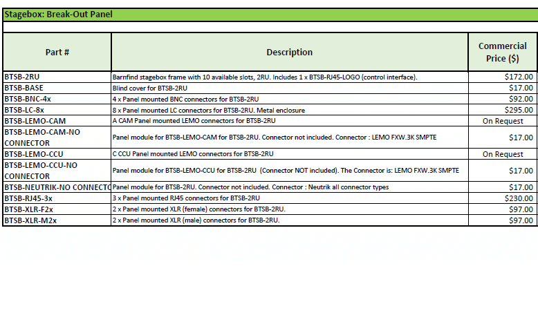 The Barnfind Stagebox Break-out panel allows you to customize your own front panel based on the required connectors. The various selection of modules will be the connection points to one or more frames.