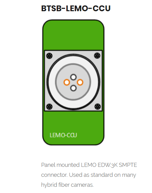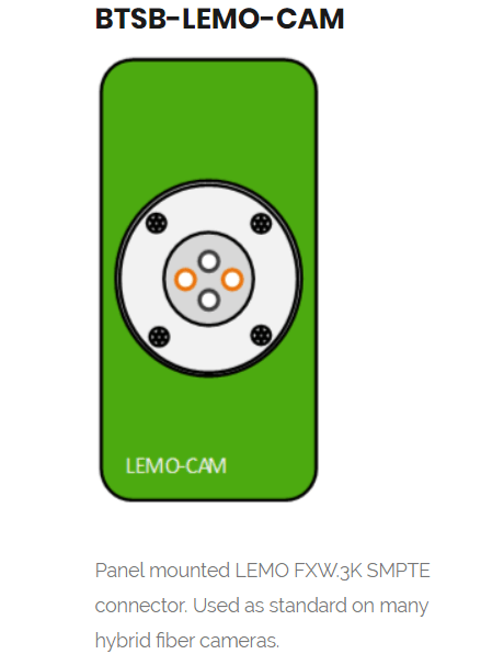Panel mounted LEMO FXW.3K SMPTE connector. Used as standard on many hybrid fiber cameras.