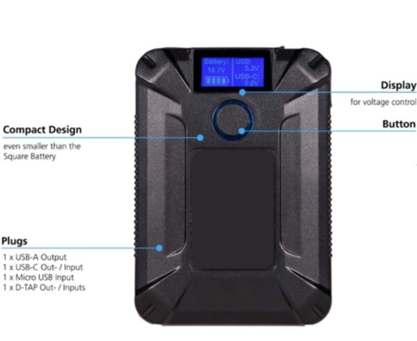 Probably the world’s smallest V-Mount battery. And it’s not just small – its powerful. With 50Wh up to 8 Amps working current and 98Wh up to 10 Amps working current you can get a lot of power out of this little buddy. With one D-Tap output and lots of other USB outputs, so you’re never running out of possibilities to power your equipment.